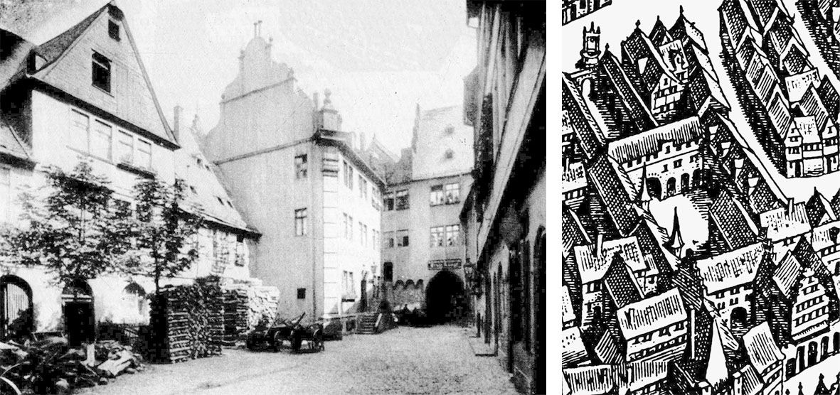 Right: Engraving of Nürnberger Hof, drawing by Matthäus Merian the Elder, 17th century, Frankfurt.