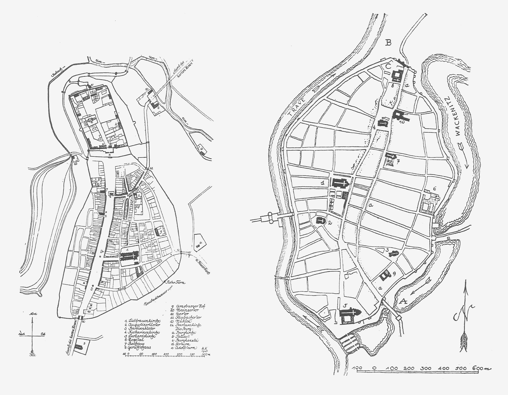 Plan of the medieval towns of Friedberg and Lübeck.