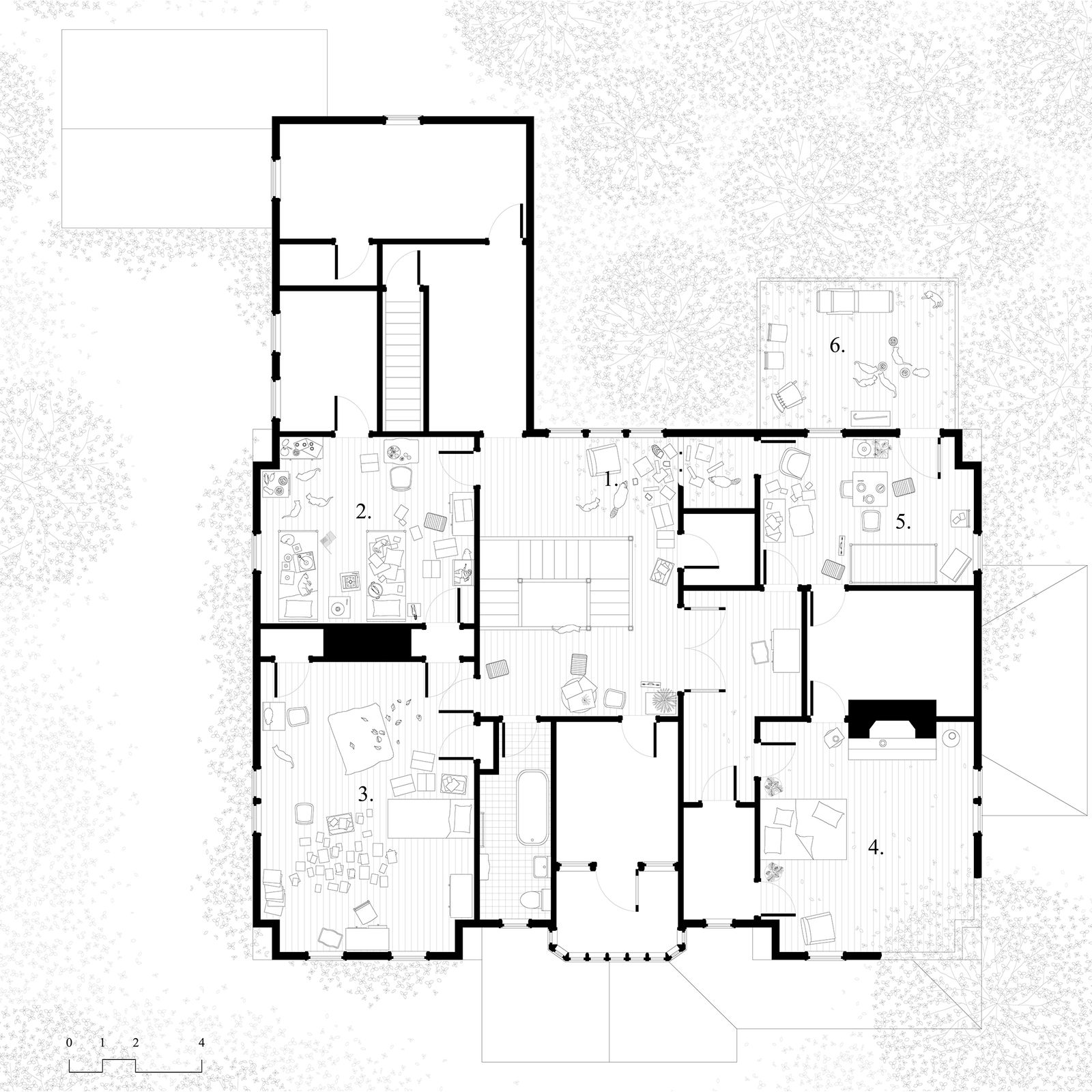 Reconstructed plan of Grey Gardens. Drawn by the authors. 1. Landing, 2. Yellow bedroom, 3. Boys’ bedroom, 4. Former bedroom, 5. Pink bedroom, 6. Balcony.
