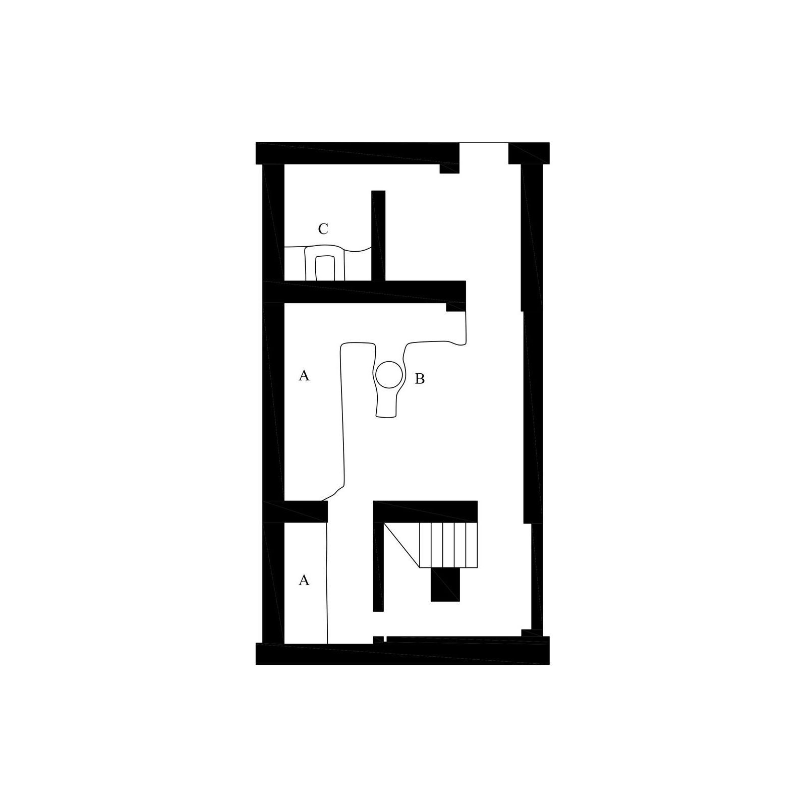 (A) Bench. (B) Pottery Hearth. (C) Quern emplacement.