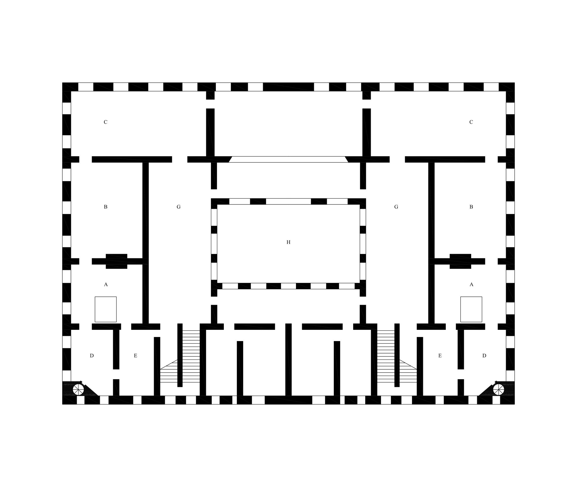 (A) Bedchamber. (B) Antechamber. (C) Sala. (D) Guardaroba. (E) Closet. (F) Staircase. (G) Open loggia. (H) Courtyard.