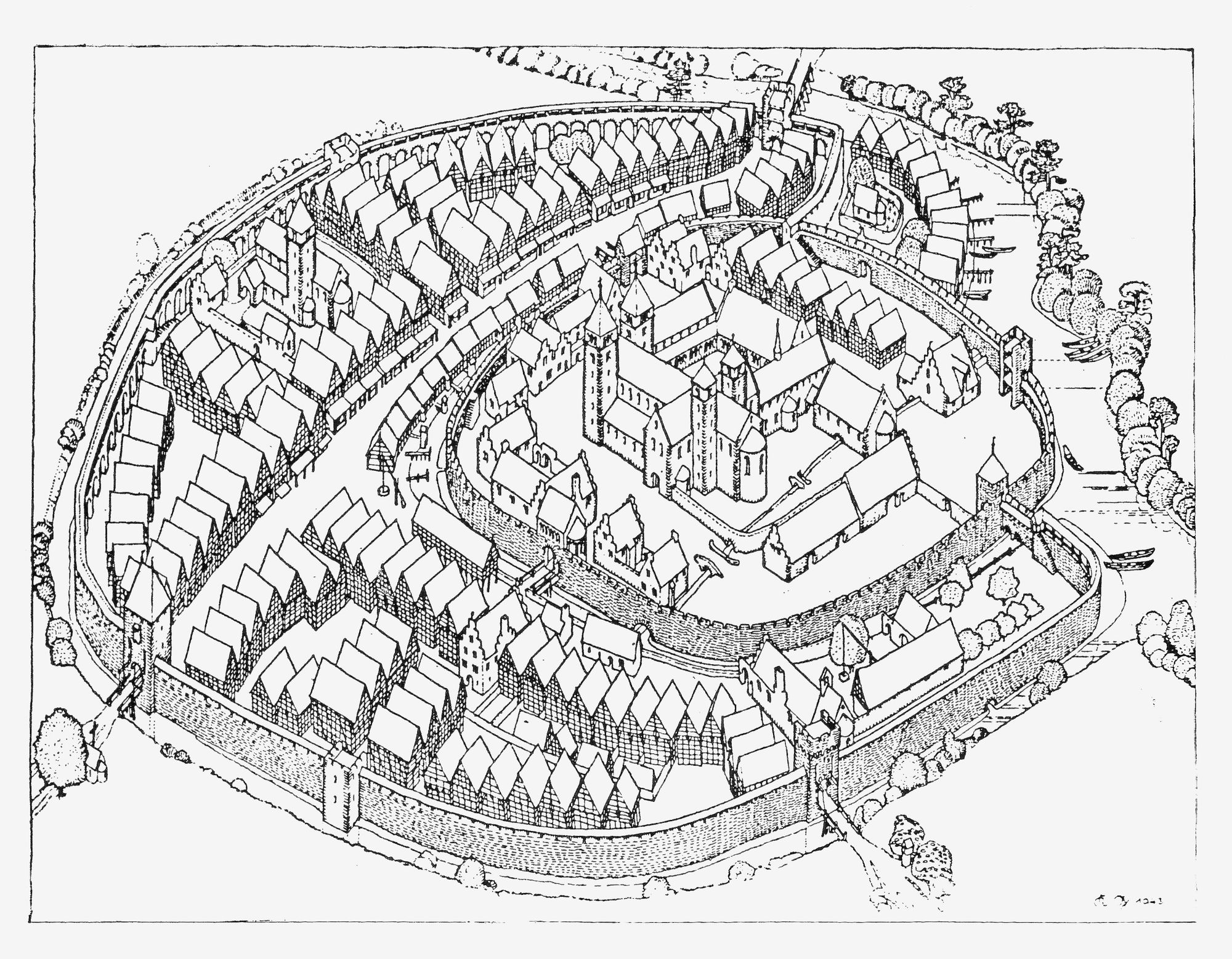 Axonometric view of the town of Freiburg.