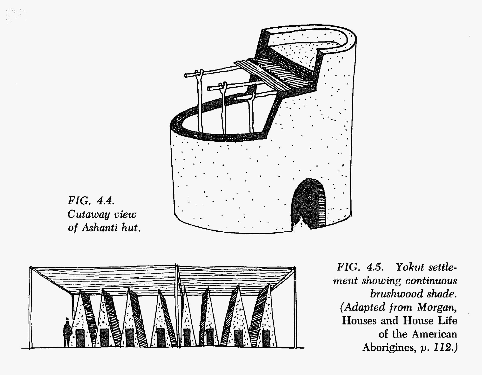 The renewed interest in the form of houses within the discipline of architecture appears to have been entangled in similar “silent opinions.” Traces can be found in the enduring search for renewal in the so-called “primitive” that underscores the works of Edward T. Hall, Henry Glassie, and Paul Oliver, Amos Rapoport, who were leading this resurgence. Rapoport, in his book, House Form and Culture (1969), was the first architectural historian to conduct a cross-cultural comparative study of house form. In the book’s introduction, he defends his choice to study “primitive” houses during the space age, arguing that: “comparisons of this type can offer an insight into the basic nature of shelter and ‘dwelling,’ of the design process and the meaning of ‘basic needs.’” As noted by Büchli, Rapoport’s views echo those expressed by Lewis Henry Morgan a century earlier: “All the forms of this architecture sprang from a common mind, and exhibit, as a consequence, different stages of development of the same conceptions, operating upon similar necessities.” The postwar research into house-types echoes the nineteenth-century ambition to uncover that original essence shared by humanity through the cross-cultural and cross-temporal study of dwelling types. What underlies this continued pursuit of universality and the theories built around it is an ever-present agenda of modernization and development.