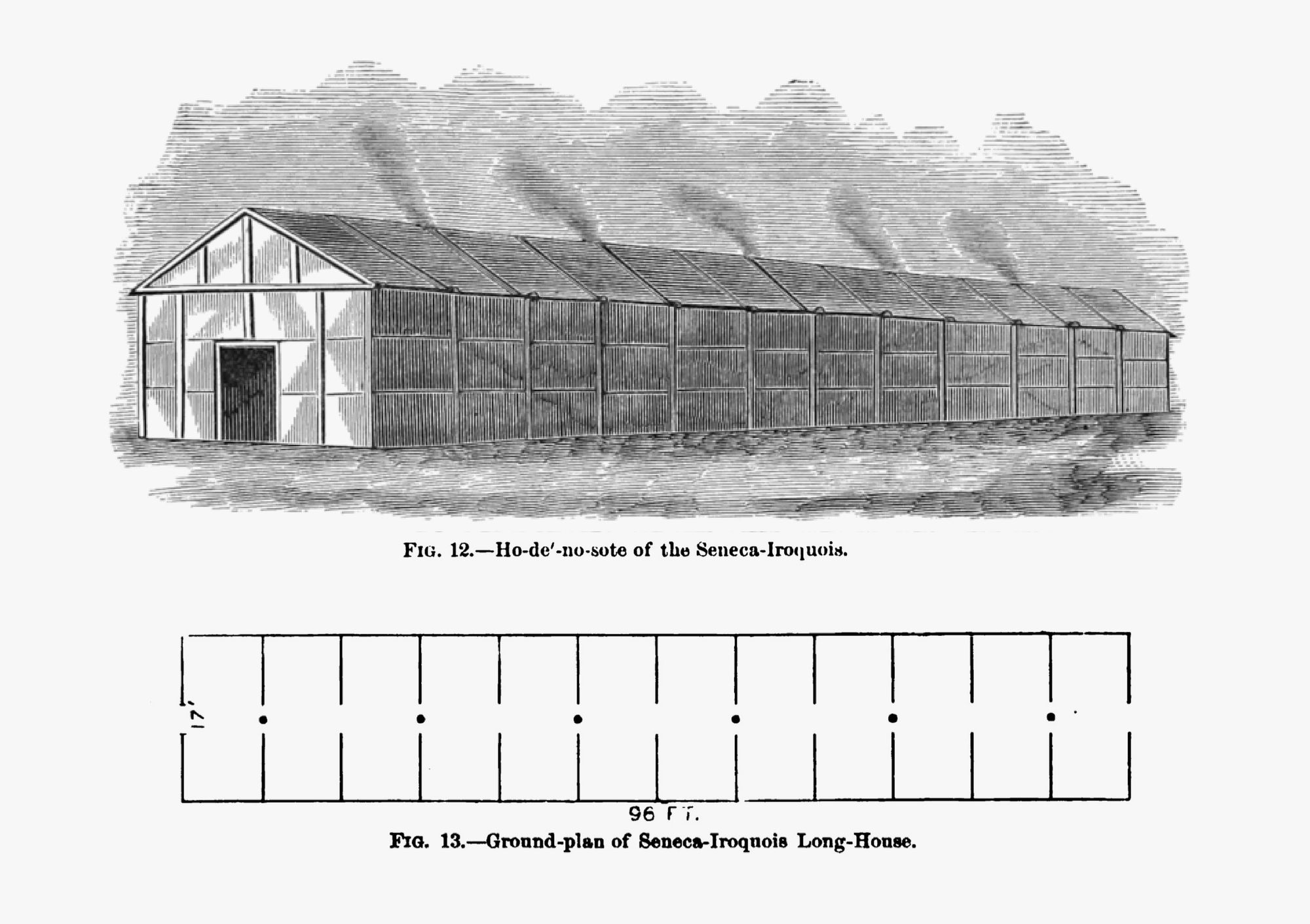 This functional-evolutionary reading is best exemplified in the work of American anthropologist Lewis Henry Morgan (1818-1881). In Ancient Society (1877) he developed a theory of progressive societal development. According to Morgan, each stage (Savagery, Barbarism, Civilization) was driven by technological advancements reflected in changing family structures as well as house designs. In the final volume of his work, Houses and House-life of the American Aborigines (1881), Morgan examined various typologies of Native American domestic architecture to support his evolutionary theory. Morgan argued that Native house-types, such as the Iroquoian longhouse, embodied a principle he termed, “communism in living.” In this arrangement multiple generations lived collectively, sharing resources under the leadership of the clan mother. The design of the Iroquoian longhouse came to represent an alternative social paradigm, where lineage and property were passed through the female line, men joined their wives’ households and could be easily expelled for misconduct, and women held considerable autonomy and power in both household and village decision-making. According to Morgan, this mode of living and habitation among the Iroquois reflected an ancient matriarchal past that had vanished in the Western world due to the West’s advancement along the ladder of “social progress.” Through drawing and descriptions of these types of houses, Morgan turned them into object-symbols that conveniently aligned with his ambitious evolutionary theory.