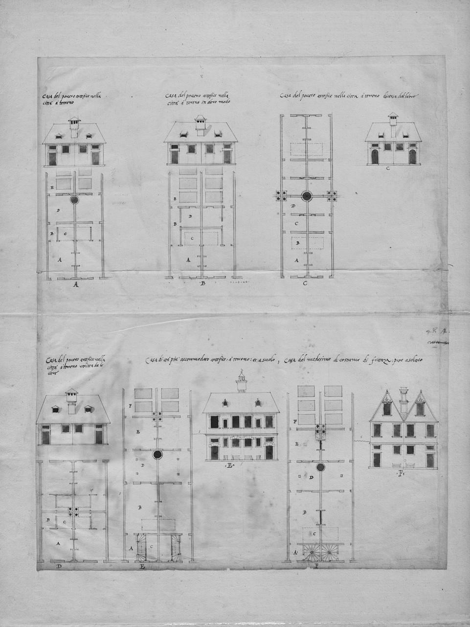 Houses for the poor artisans and citizens in the countryside and in the city. Adapted from Plates I (Projects A1-C3) and XLVIII (Projects A-F), Sebastiano Serlio, The Sixteenth-Century Manuscript of Book VI in the Avery Library of Columbia University (Mineola, New York: Dover Publications, 1996). Drawn by Theodora Giovanazzi.