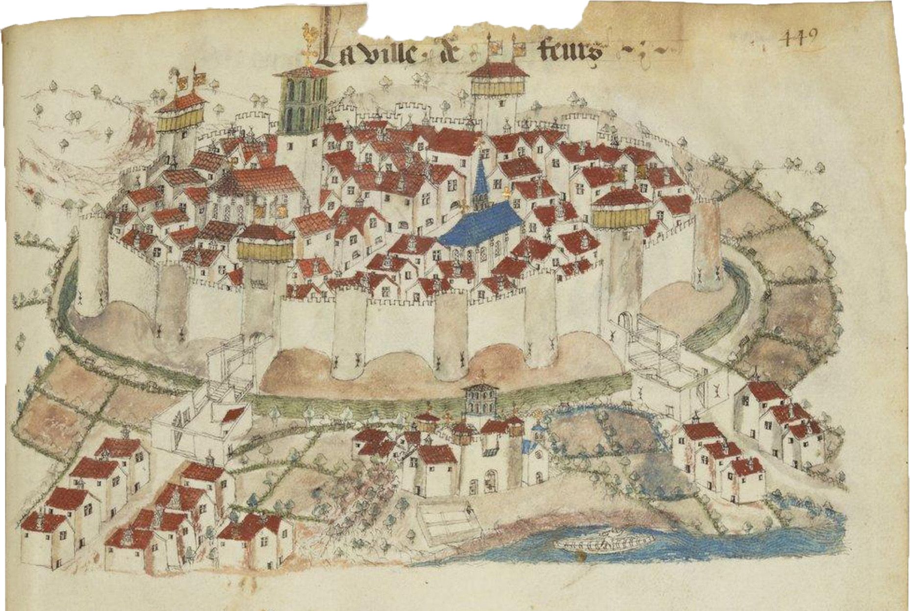 Guillaume de Revel, The Town of Feurs, ca. 1456. Paris, Bibliothèque Nationale, Ms. fr. 22297, folio 499, ink on parchment. The Picture Art Collection / Alamy
