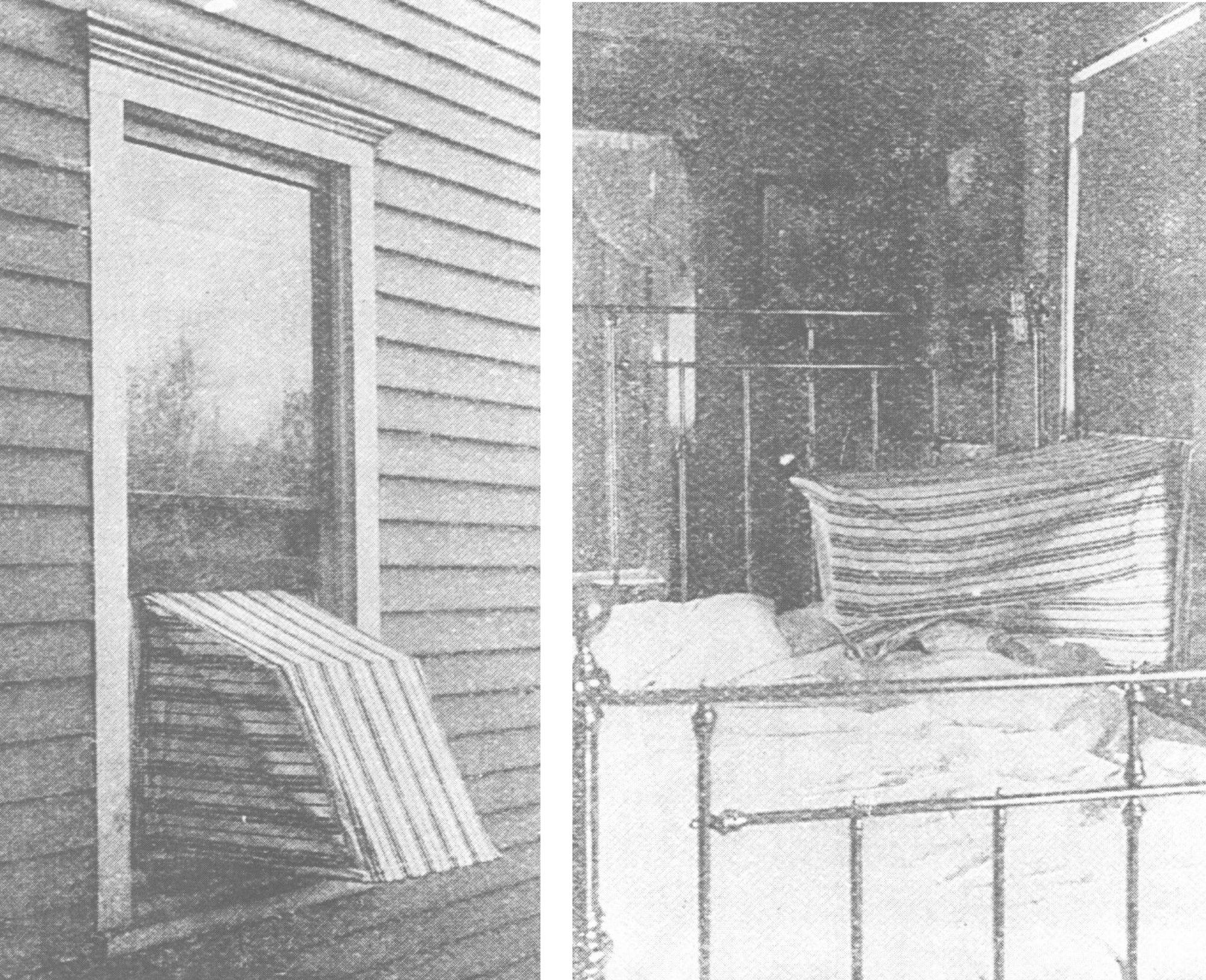 There are two solutions to this difficulty of keeping the body warm yet sleeping in the outdoor air. One uses a window bed, where the head of the bed extends over the window sill at night, and the sleeper pulls an awning over his head to protect himself from rain. When above the first floor, however, this method makes one feel the possibility of falling, and worse yet the “bed shows from the outside of the dwelling.” The other method is a fresh air tent, which is inconspicuous. It fits around the open window and extends inward over the head of the bed and the head of the sleeper. This tent has a window on the bedroom side so the sleeper can converse with others in the room, and it can be used in a double bed where only one person wants the air.