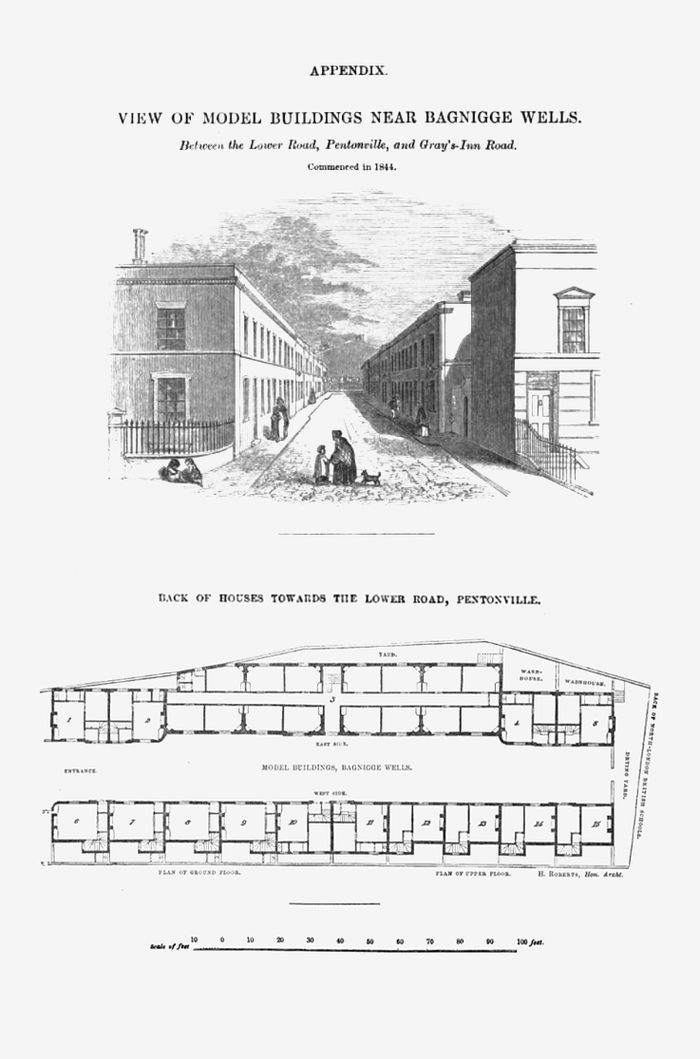 Henry Roberts, Model Buildings near Bagnigge Wells, 1846, perspective and plans.